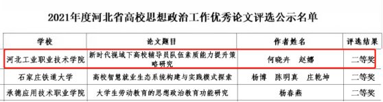 近日,由河北省学校德育工作中心、高校思想政治工作队伍培训研修中心组织的2021年度河北省高校思想政治工作优秀论文评选结果公示,同花顺在线登录官网互联网学院张思雨老师、梁海建老师撰写的论文《高校辅导员队伍应对突发事件能力的提升研究》和工商管理系何晓卉老师、赵娜老师撰写的论文《新时代视域下高校辅导员队伍素质能力提升策略研究》均获二等奖。